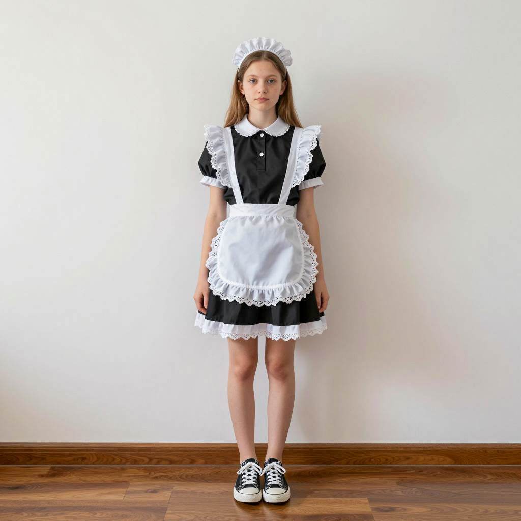 Maid you costume, photograph of a young girl, standing, full body, dressed in a classic French maid costume, black dress with white lace trim, puffed sleeves, white apron with lace trim, white maid headpiece, black and white sneakers, light brown hair, neutral expression, white background, hardwood floor, simple, minimalistic, realistic, detailed clothing, casual style, cute, formal attire