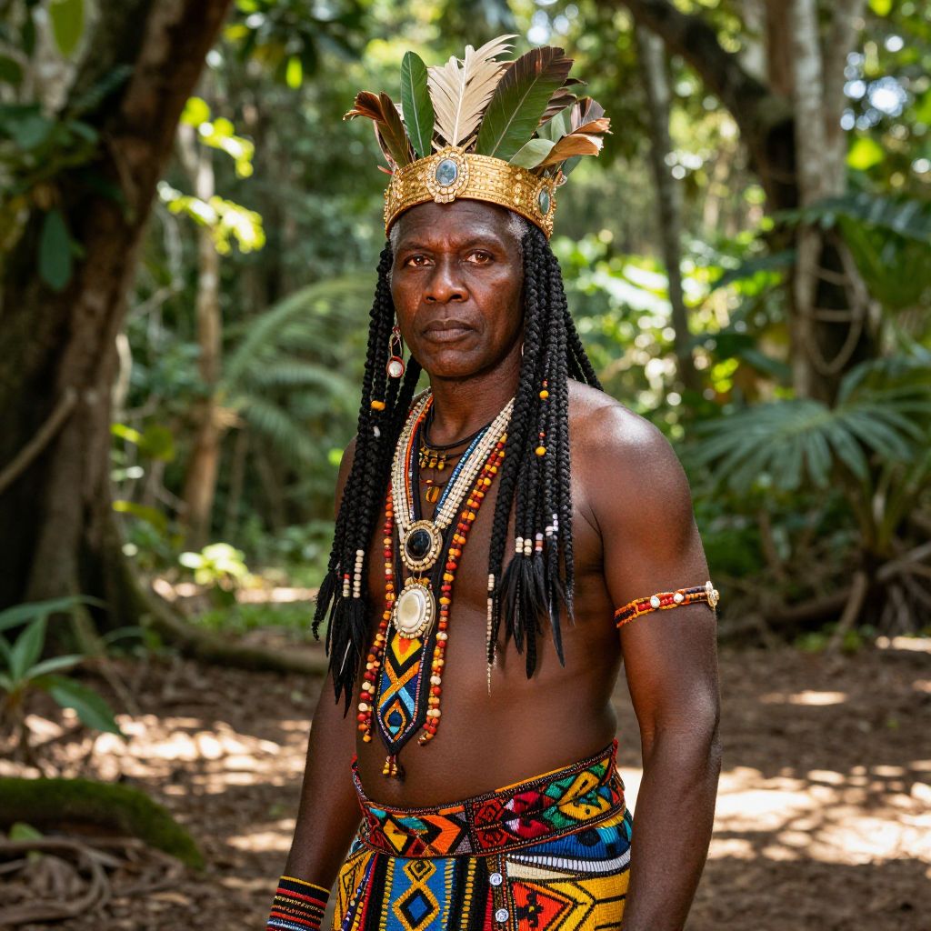 A tall, dignified man with deep brown skin and warm, wise eyes, wearing traditional tribal attire with vibrant patterns, has intricate, hand-crafted braids flowing down his back, each braid adorned with small beads and feathers. A golden crown made of woven leaves and precious stones rests upon his head, symbolizing wisdom and leadership. He stands confidently in a sun-drenched jungle clearing, surrounded by lush greenery, with sunlight filtering through the canopy, casting dappled shadows on the ground. The atmosphere is serene and powerful, evoking a sense of cultural pride and ancient heritage.