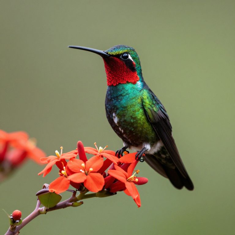 Male Hillstar hummingbird perched gracefully on a vibrant Chuquiraga jussieui flower in Ecuador, showcasing its iridescent green plumage and striking red throat against a soft green backdrop.
