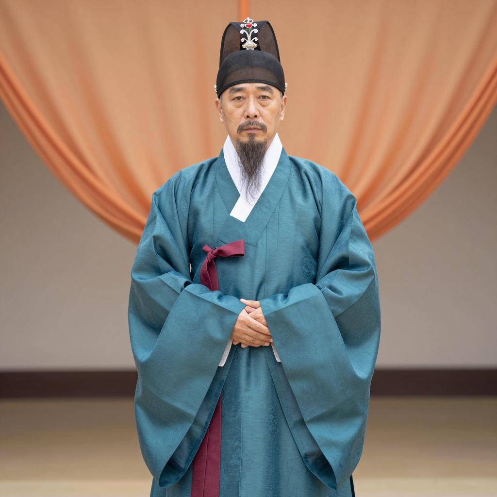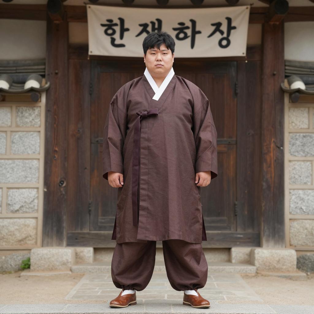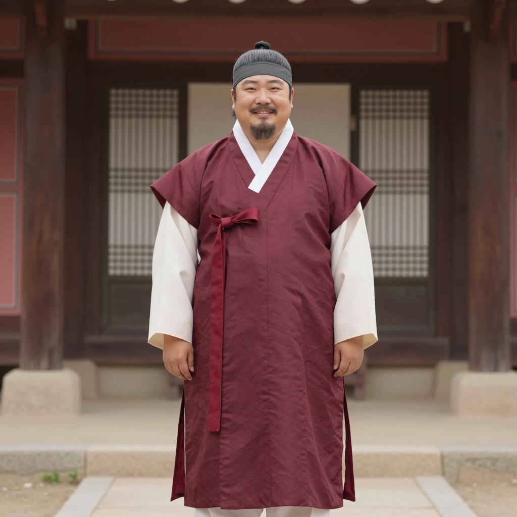 Portrait of a plus size Asian man wearing traditional Korean hanbok with a maroon overcoat and red sash. The man has grey hair styled in a topknot, a mustache, and tan skin. He is standing outdoors in front of a traditional Korean building with wooden doors and vertical panels, under natural daylight. The background is slightly blurred, highlighting the full body frontal view and casual stance with a slight smile.