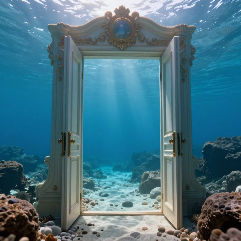 A grand, opulent doorway opens to an otherworldly underwater passage, where sunlight filters through a serene blue expanse dotted with rocks and pebbles, defying the boundaries between land and sea.