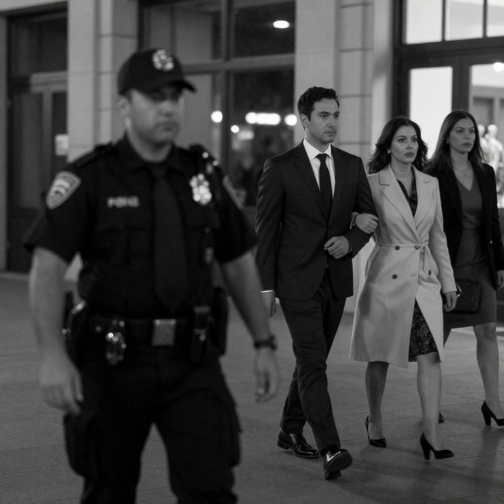 Black and white photograph. Nighttime street scene. Police officer in foreground, blurred motion. Man in suit, woman in light coat and skirt, walking together, right center. Columns, storefronts, and lit window in background. Three people, intense expressions.