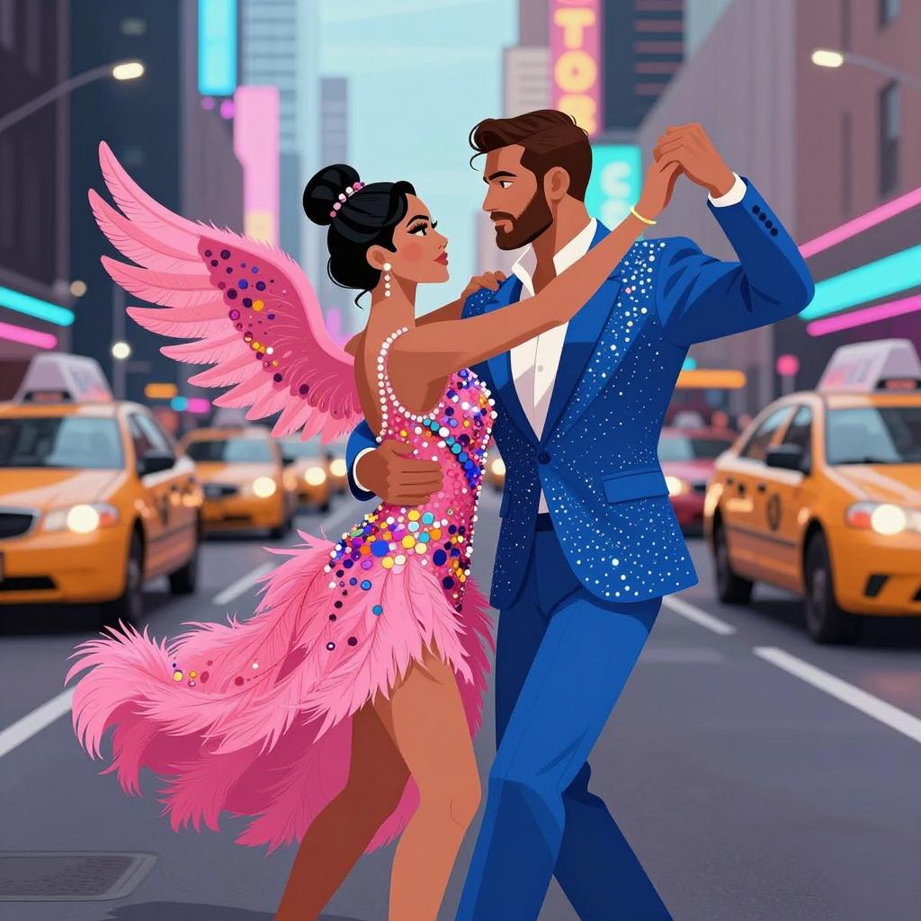 Illustration of a dancing couple in a vibrant city street. The woman wears a pink, sequined, feathered dress with large wings, and the man wears a blue, sequined suit. They face each other, arms extended. Background features colorful, neon-lit skyscrapers and yellow taxis. The woman's dress and the man's suit both have bright, multicolored sequins. The man has a beard. The woman's hair is styled in an updo. The street is wet, reflecting lights. Both have intense expressions.