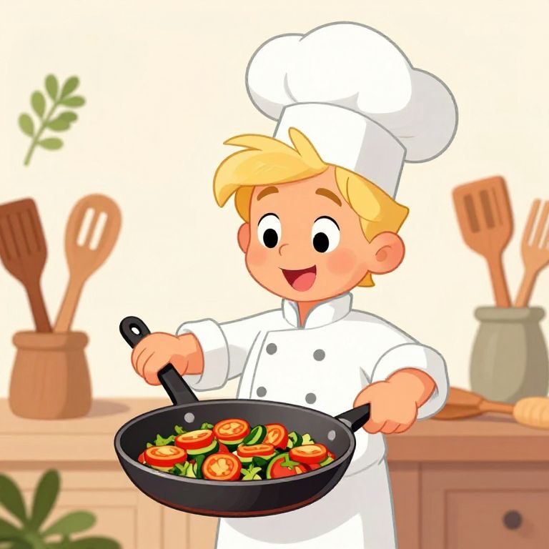 Cartoon child chef with blond hair, white uniform, and hat, proudly holds a black frying pan with colorful vegetables. Kitchen background with wooden utensils