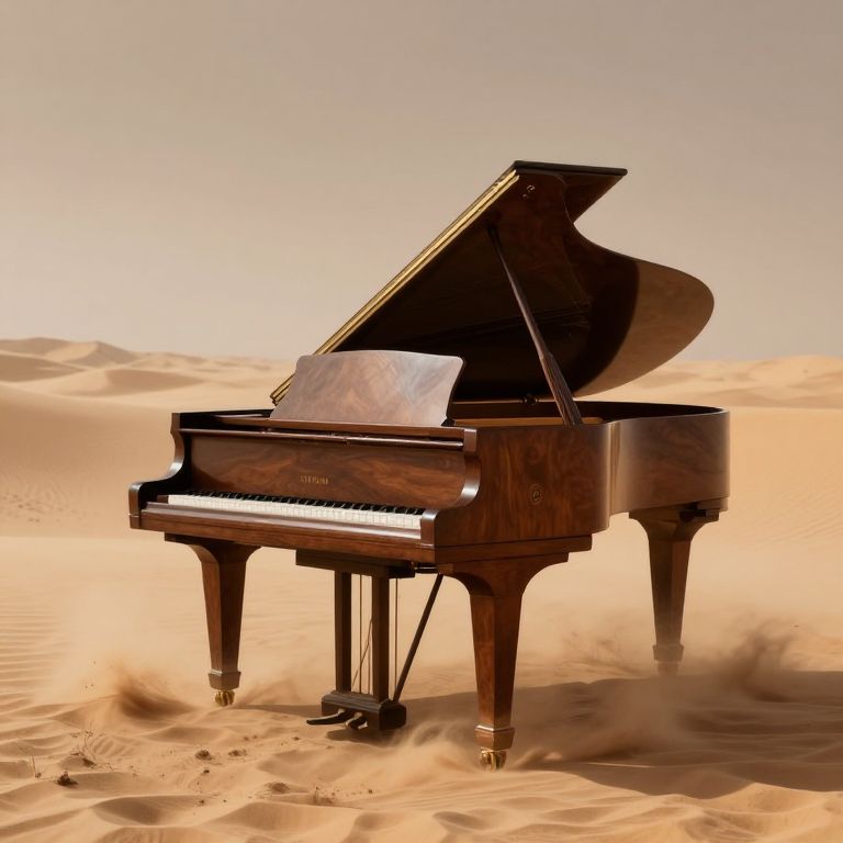 Grand piano stands solemnly in the heart of a desert storm, its polished wood gleaming amidst swirling sands and golden dust, as gusts of wind resonate through its strings, weaving a haunting symphony of nature's fury and music's soul.