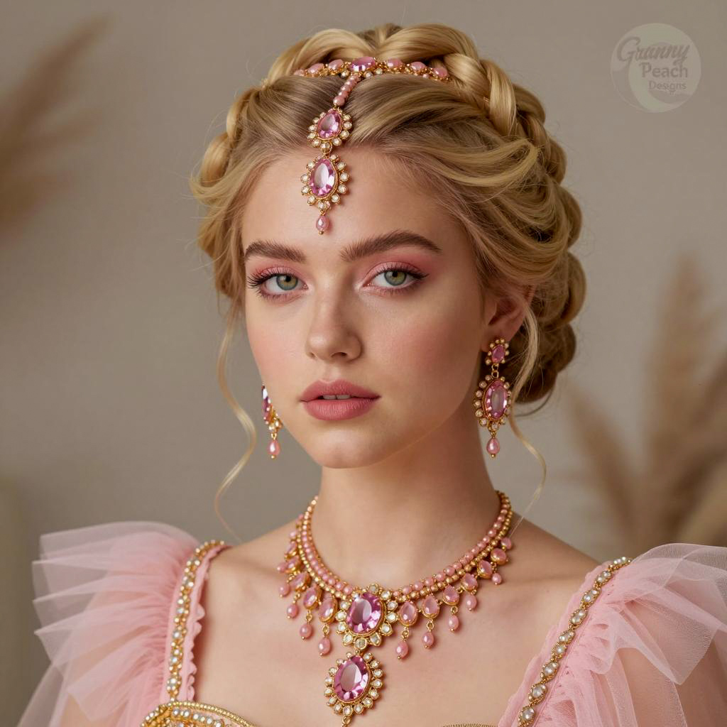 Photograph of a young woman with fair skin, blonde hair in an intricate updo, wearing pink and gold jewelry. She has pink eyeshadow, green eyes, and a neutral expression. She wears a pink and gold necklace with a large central gem, matching earrings, and a pink tulle garment. A pink and gold headpiece is positioned on her forehead. The background is blurred and neutral. Watermark "Granny Peach Designs" is in the top right corner.