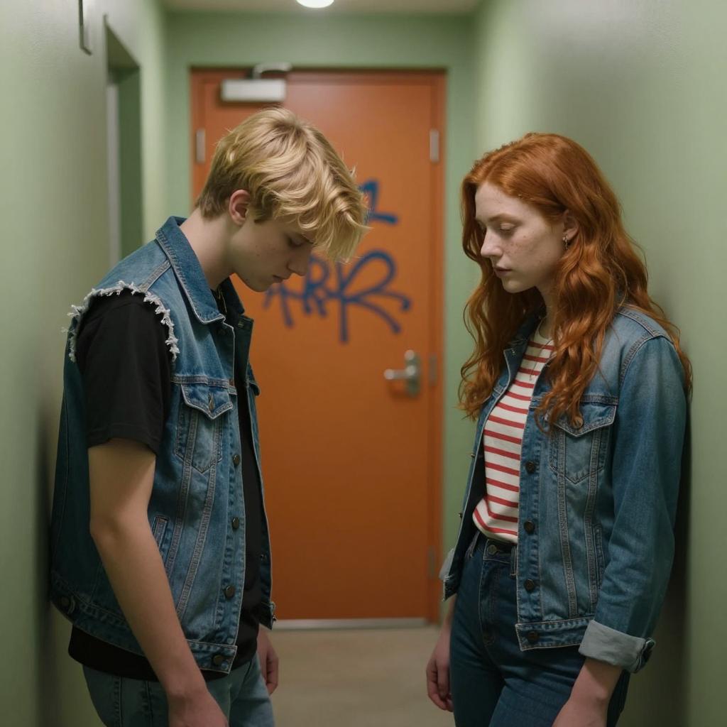 Two teenagers in a dimly lit hallway. Girl with long red hair, wearing a denim jacket over a striped shirt, stands to the right, looking down. Boy with short blonde hair, wearing a black shirt and denim vest, bends over to the left, looking down. Orange door with graffiti in the background. Green wall to the left.