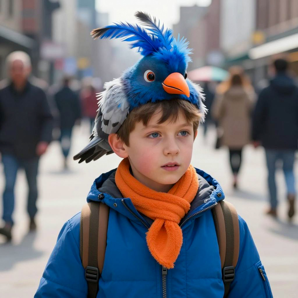City slicker pigeon kid, photograph of young boy, realistic style, street background, daytime, bright sunlight, child with blue feathered headpiece resembling a bird with orange beak, blue feathers with white tips, orange scarf, blue jacket, brown straps on front, blue eyes, fair skin, slightly blurred background with people and buildings, vibrant colors, detailed ures, realistic lighting, casual outdoor setting, close-up shot