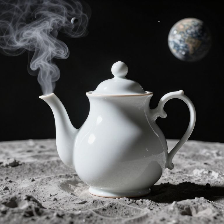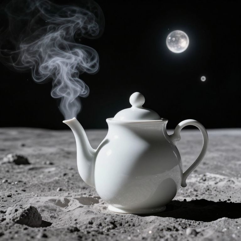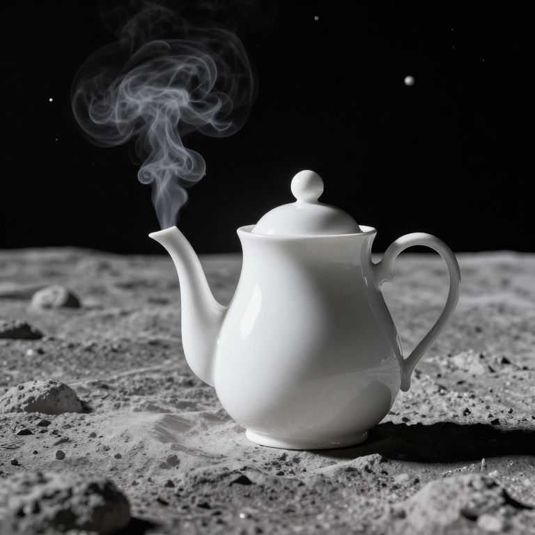 A serene, oversized porcelain teapot stands alone on the lunar surface, its spout emitting wisps of steam that transform into luminous orbs suspended in the void, defying gravity and reality alike.