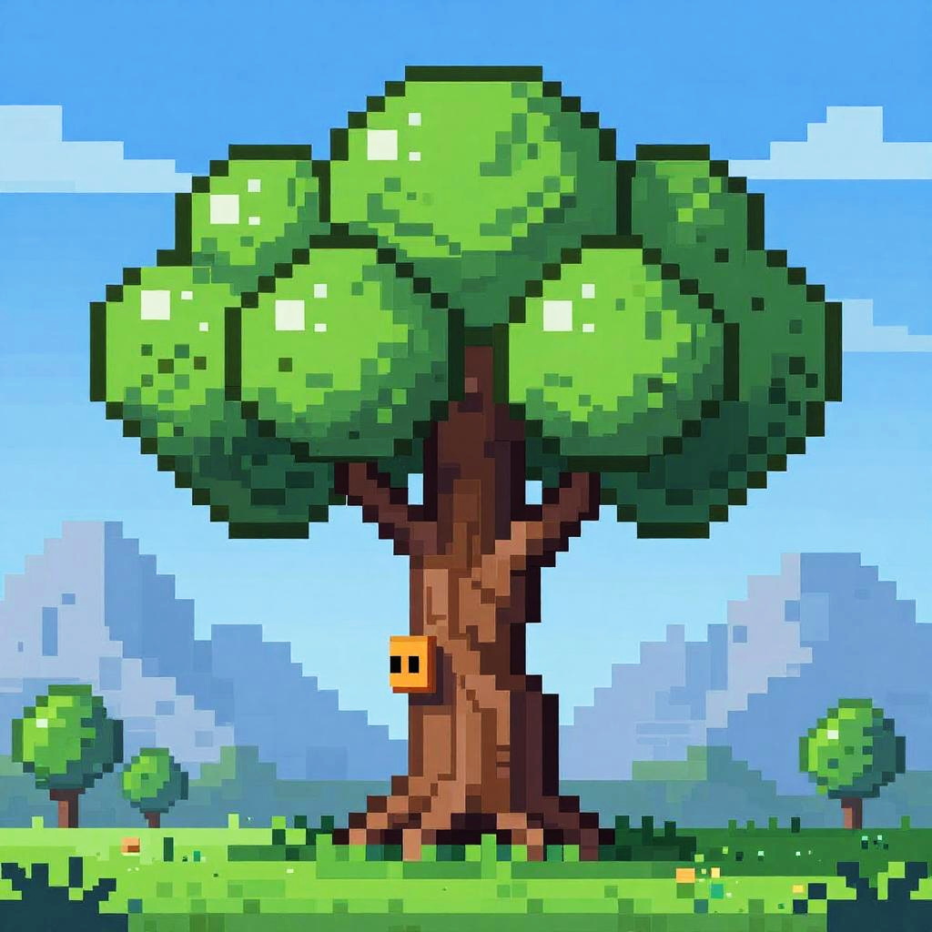 Pixel art tree with twisted trunk and emerald leaves, detailed pixel shading and highlights, set against a pixelated mountain background with a blue sky