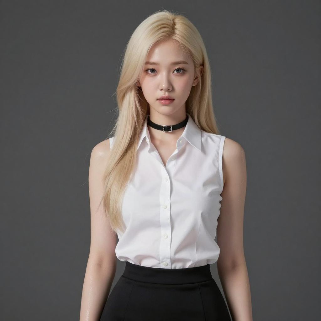(best quality), (realistic, photo-realistic:1.3), (masterpiece:1.3), CG, unity, 8k, amazing, finely detail, ultra-detailed, highres, absurdres, sleeveless white button shirt, black skirt, black choker, (1 girls), solo, cute, sexy body, (innocent face), young, (Kpop idol), (aegyo sal:1), (platinum blonde hair:1), ((puffy eyes)), looking at viewer, full body, facing front, extremely delicate and beautiful, extremely detailed, beautiful detailed girl, detailed fingers, best shadow, extremely detailed eyes and face, beautiful detailed nose, beautiful detailed hand, beautiful detailed eyes, beautiful delicate glossy lips:0.8, (glossy face and body skin), ((oily body skin)), ((dramatic light))