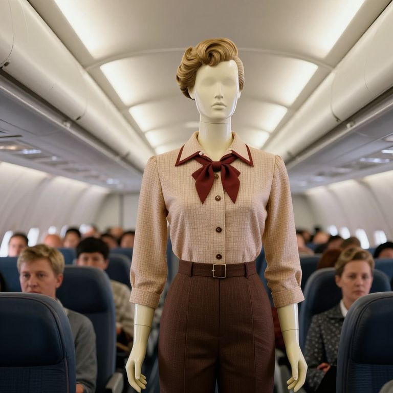 Photograph of a white mannequin standing in the aisle of an airplane. The mannequin has short, styled blonde hair and wears a vintage-style, pink checkered blouse with a maroon bow tie and maroon high-waisted pants. The background shows a brightly lit airplane cabin with rows of seated passengers, some looking forward and others looking down. The seats are dark blue, and the overhead compartments are visible on either side. The overall scene blends a retro fashion element with a modern airline setting.