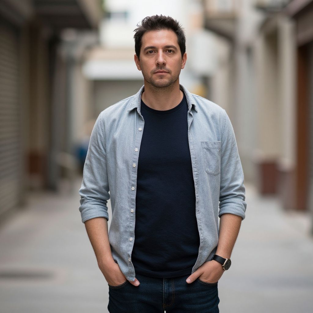 A man, charcoal Henley shirt, khaki chinos, black leather sneakers, tailored denim jacket, lush tropical foliage, vibrant orchids in bloom, 3M analog film stock, relaxed smile, casual confidence. Man has masculine face and piercing eyes