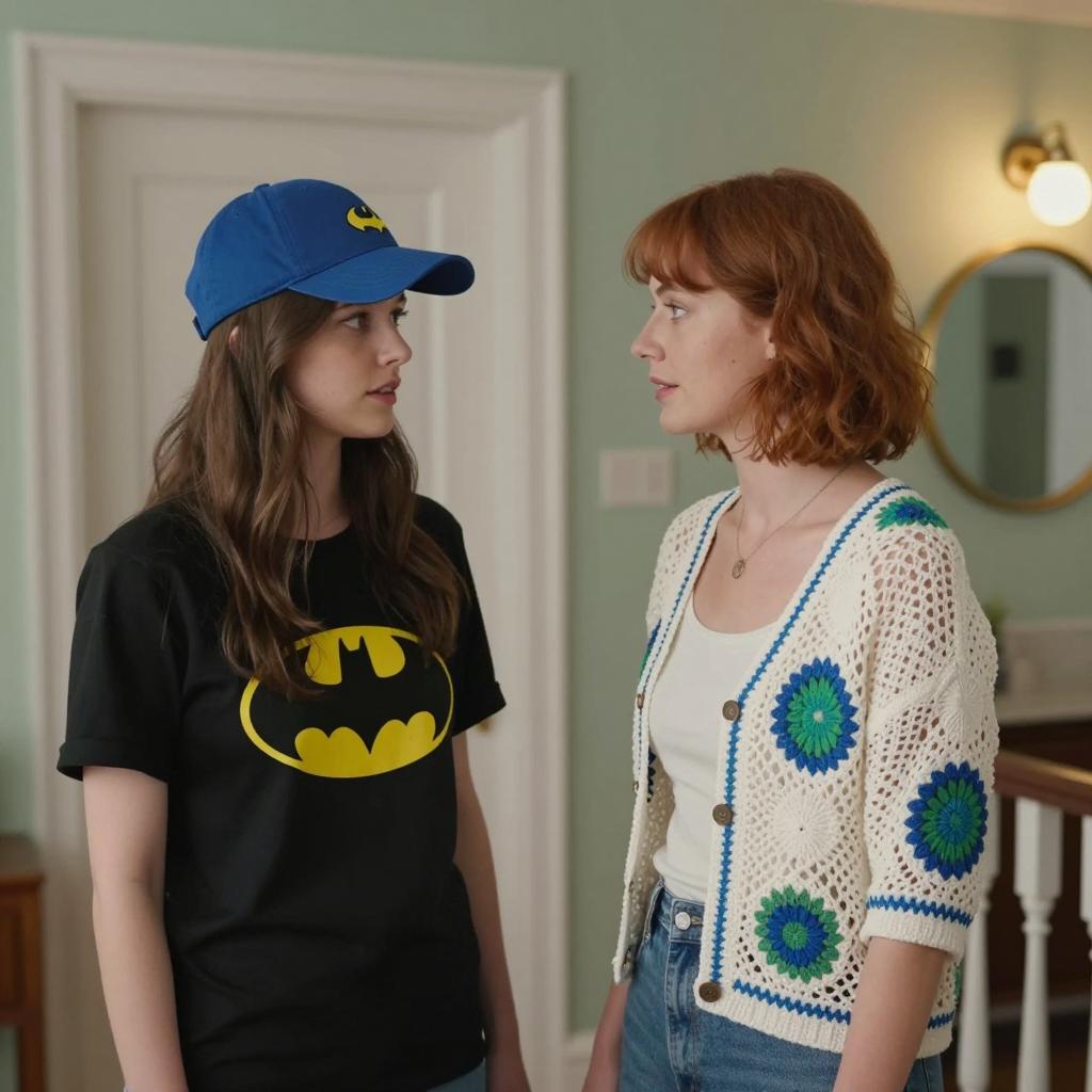 Two women standing in a narrow hallway. One with short brown hair, blue blouse, knee-length gray skirt, and green handbag. The other with long red hair, green long-sleeve top, black skirt with white dots, and black shoes. Open door on the right, wooden chair between them. Bookshelf with colorful books on the left, light-colored sofa in the foreground. Light from window in the background. Both women smiling, facing each other.