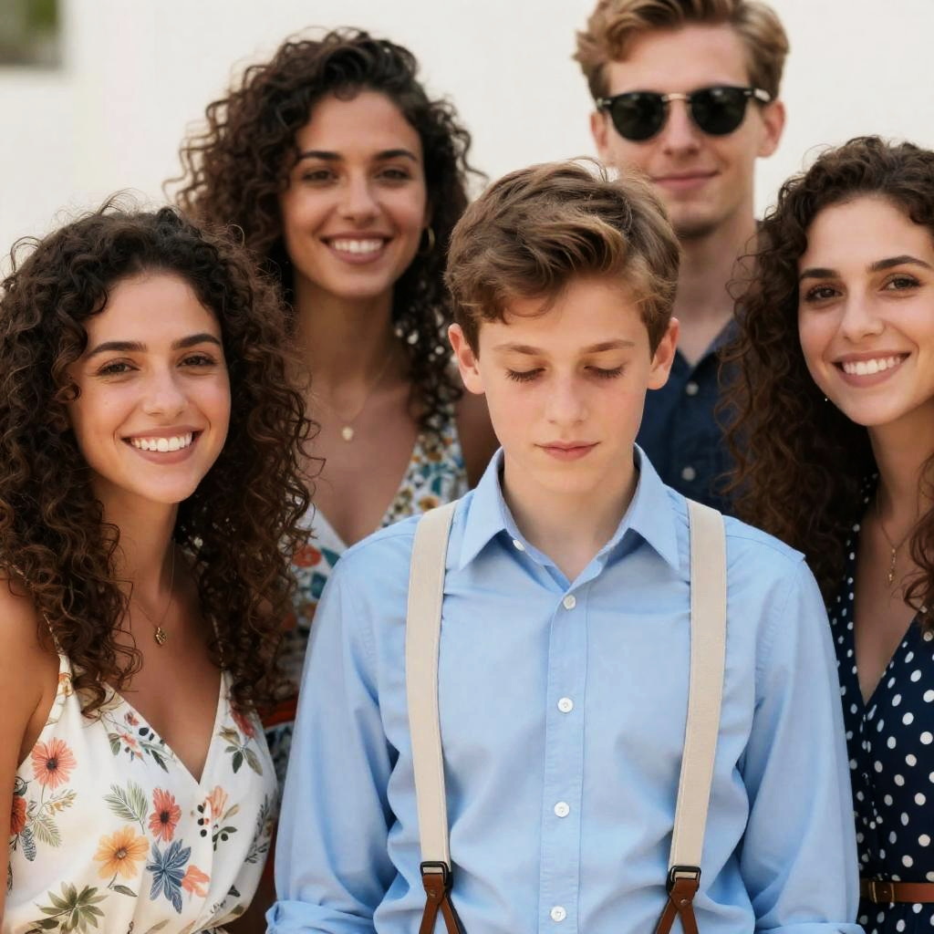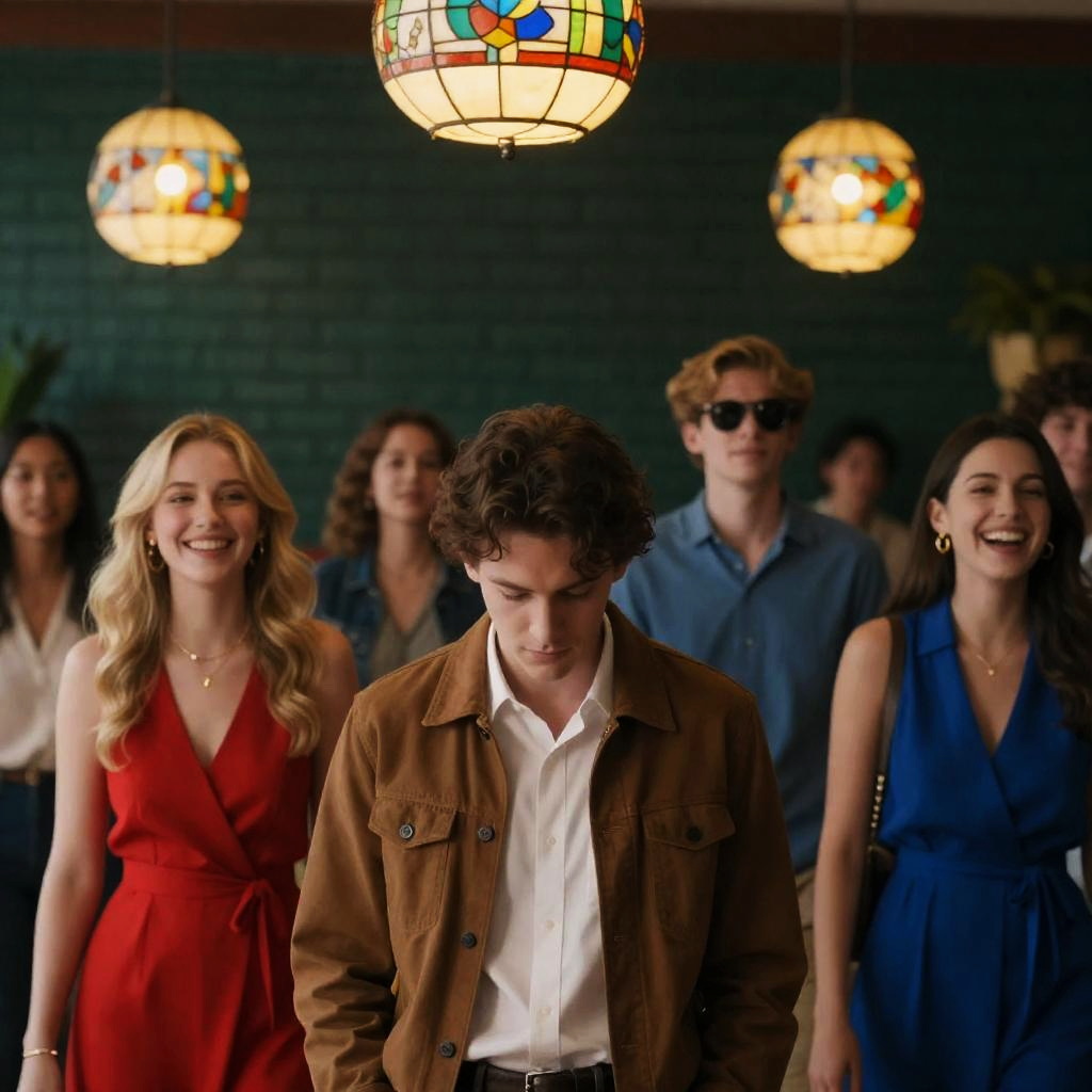Group of people in a brightly lit, colorful room. Blonde woman in red dress smiling, man in brown jacket looking down, man in blue shirt with sunglasses, woman in blue dress laughing, various people in background. Stained glass lights above, dark green brick walls.