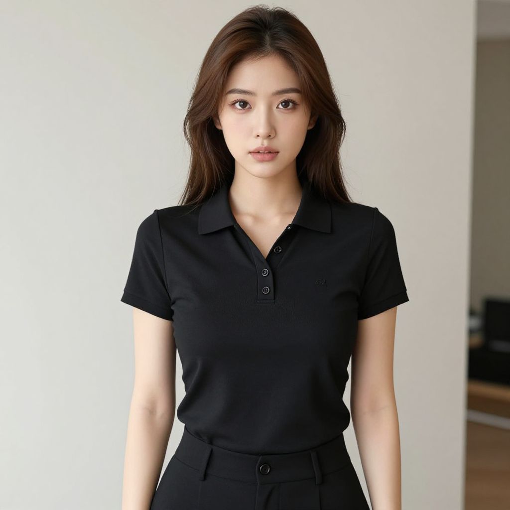 Photograph of an attractive young Asian woman standing on a golf course. She has long, dark brown hair and fair skin. She's wearing a white, short-sleeved polo shirt with black trim and a small logo on the chest, paired with white shorts and white golf gloves. She holds a golf club in her right hand. Her expression is confident and slightly serious. The background is blurred, showing green grass and trees, suggesting an outdoor, natural setting. The overall image has a crisp, realistic quality.