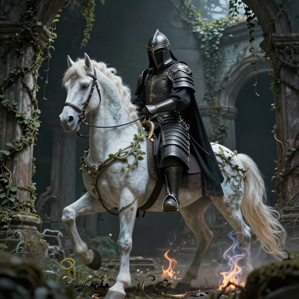 A detailed depiction of an ancient armored warrior mounted on a spectral horse within overgrown ruins. The warrior wears intricate, dark armor with a helmet obscuring the face. The horse is adorned with vines and ethereal decorations. Ghostly flames flicker near the base, adding a mythical and eerie atmosphere. Surrounding ruins are covered in creeping wild vines, with dramatic shadows enhancing the mysterious, sophisticated ambiance.