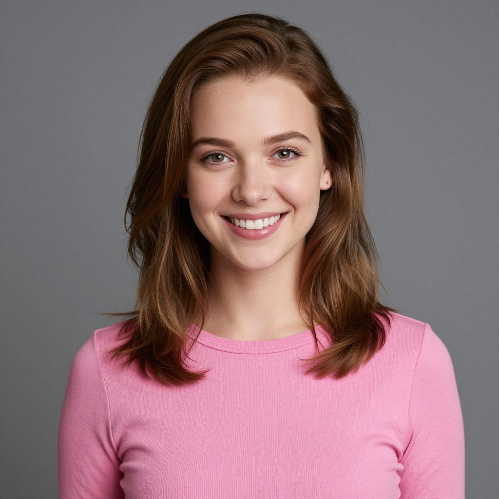Photograph of a smiling young woman with fair skin, brown shoulder-length hair, wearing a pink ribbed long-sleeve shirt, against a plain