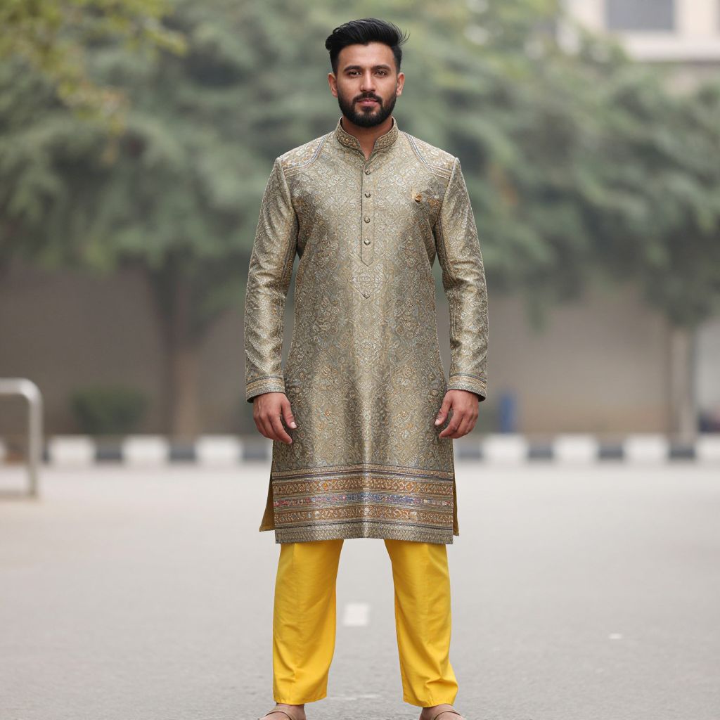 Photograph of a bearded man standing confidently on a street. He wears a gold, intricately embroidered long kurta with a high collar and yellow trousers. The kurta features detailed patterns along the bottom hem. His short, dark hair is neatly styled. The background shows a blurred, outdoor urban setting with green trees and a white and black striped road barrier. The man's skin tone is medium, and he has a serious expression. The overall style is traditional Pakistani attire with a modern urban backdrop.