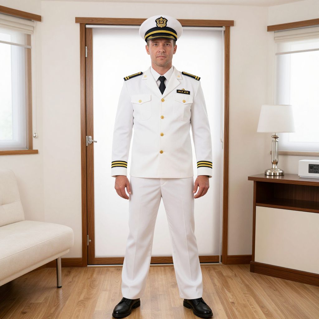 Man Yacht Captain Costume, man in a white uniform standing in a room