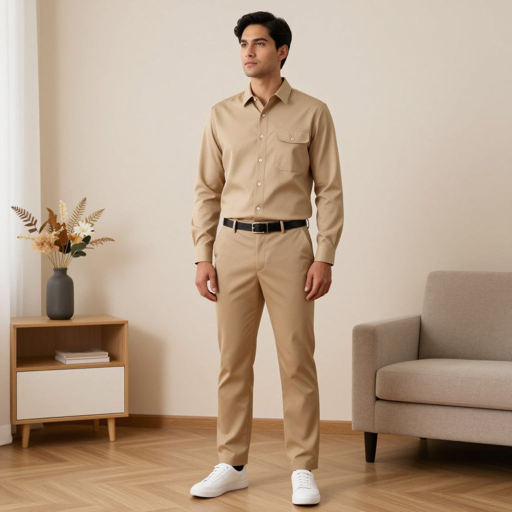 Photograph of a young man with short black hair, wearing a beige long-sleeve shirt and matching pants, white belt, and white sneakers,