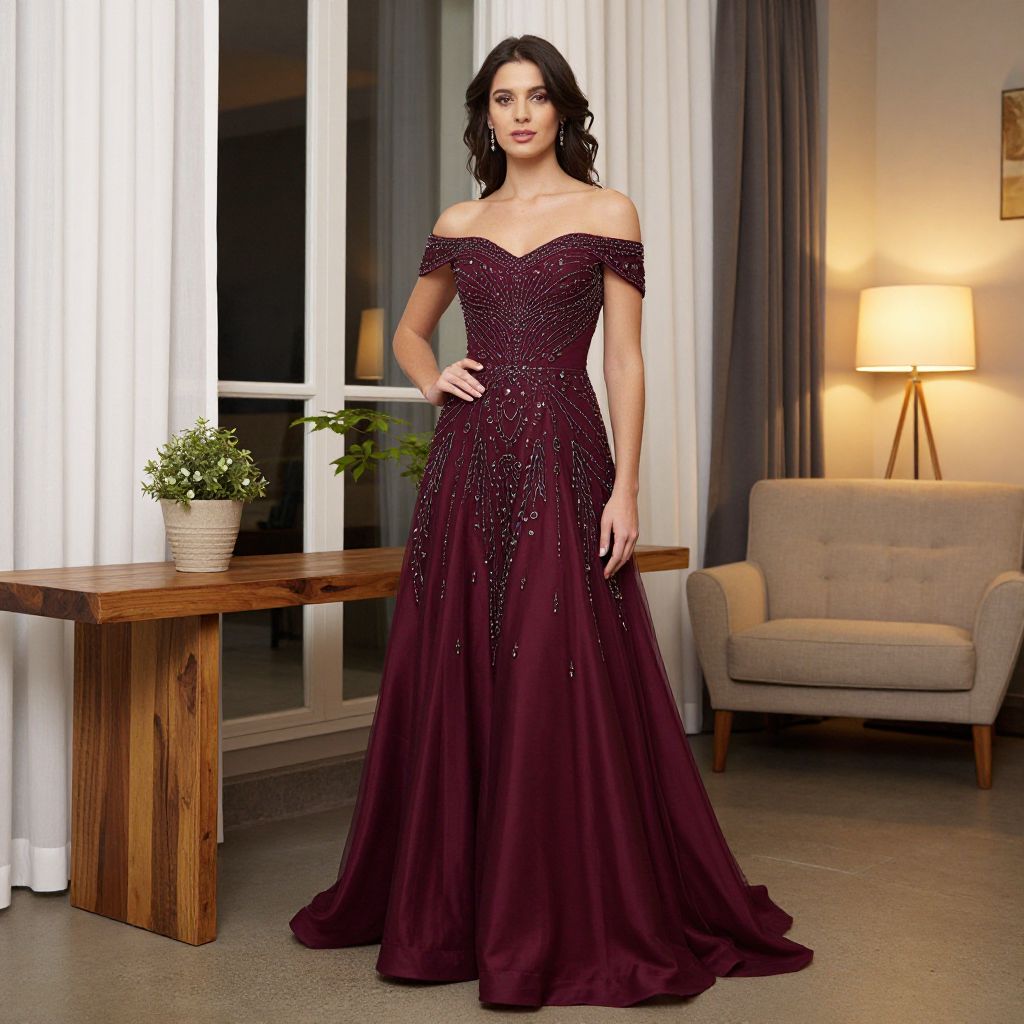 Photograph of a woman with long black hair in an off-the-shoulder, deep burgundy, sparkling evening gown, standing in a modern living
