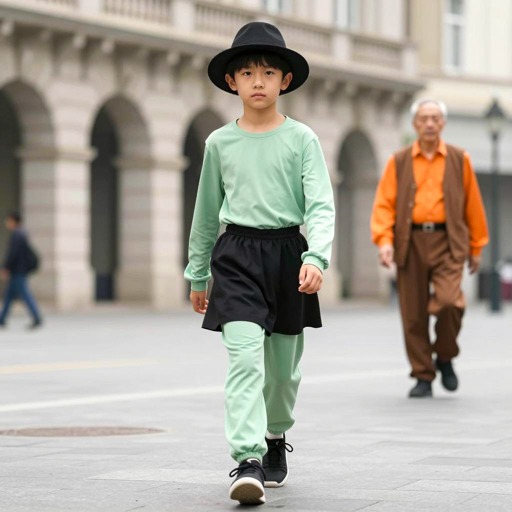 Dance line costume, photograph of young Asian boy walking on city street, wearing light green long-sleeve shirt, light green pants, black hat, black sneakers, black skirt over pants, serious expression, blurry background with older man in orange and brown outfit, classical building with arches, daytime, realistic style, urban setting