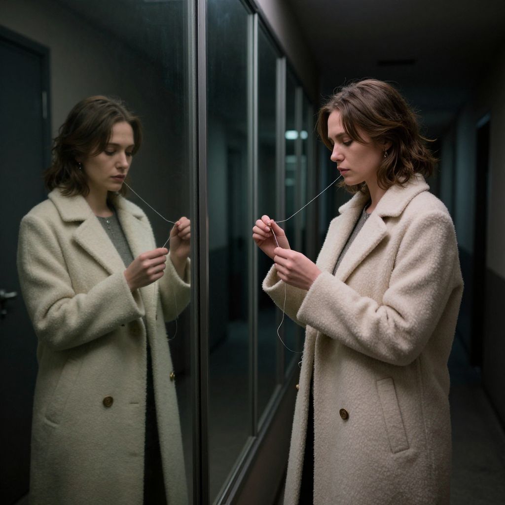 A woman in a cream-colored coat stands in a dimly lit hallway, her reflection captured in a series of mirrors that evoke a surreal, cyberpunk aesthetic, as she examines a delicate thread, symbolizing the intricate stitching of memories into garments that shift with the viewer's emotions.