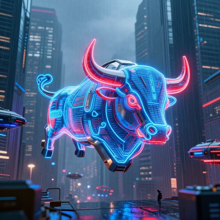 A digital CGI image depicting a glowing neon-blue and red holographic bull mid-leap in a futuristic, rainy cityscape. Tall, dark skyscrapers frame the background, illuminated by various lights. The bull has intricate circuit-like patterns and red horns, with a small figure in silhouette standing below. Raindrops are visible on the wet street, reflecting the neon lights. The overall style is cyberpunk, with vibrant neon contrasts against the dark, moody city environment.