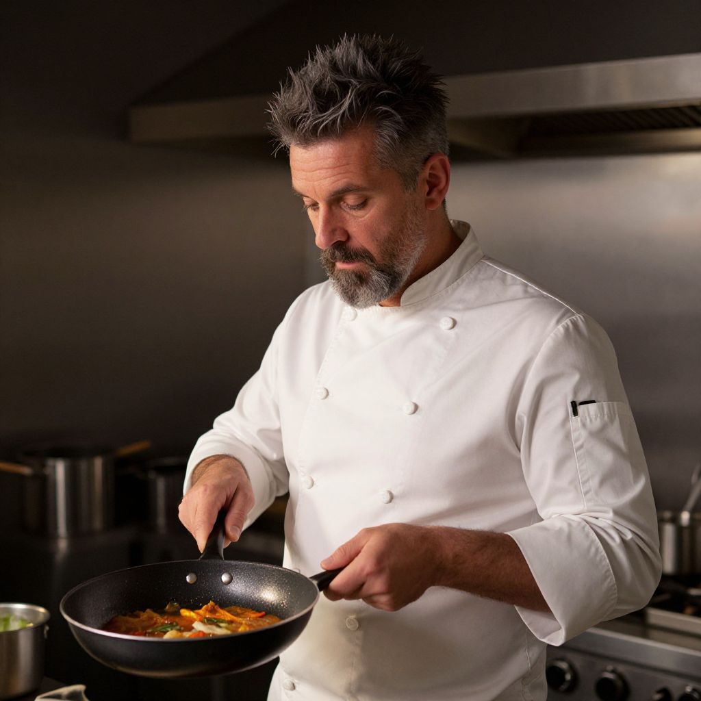 A photograph of a middle-aged male chef with gray hair and beard, wearing a white double-breasted chef's jacket. He is focused on cooking, stirring a black skillet with orange and green vegetables using a black spatula. The background is a modern, dimly lit kitchen with stainless steel appliances and a range hood. The chef's expression is concentrated, and the lighting highlights his face and jacket, creating a slight glow. The image has a high-contrast, slightly dramatic style.