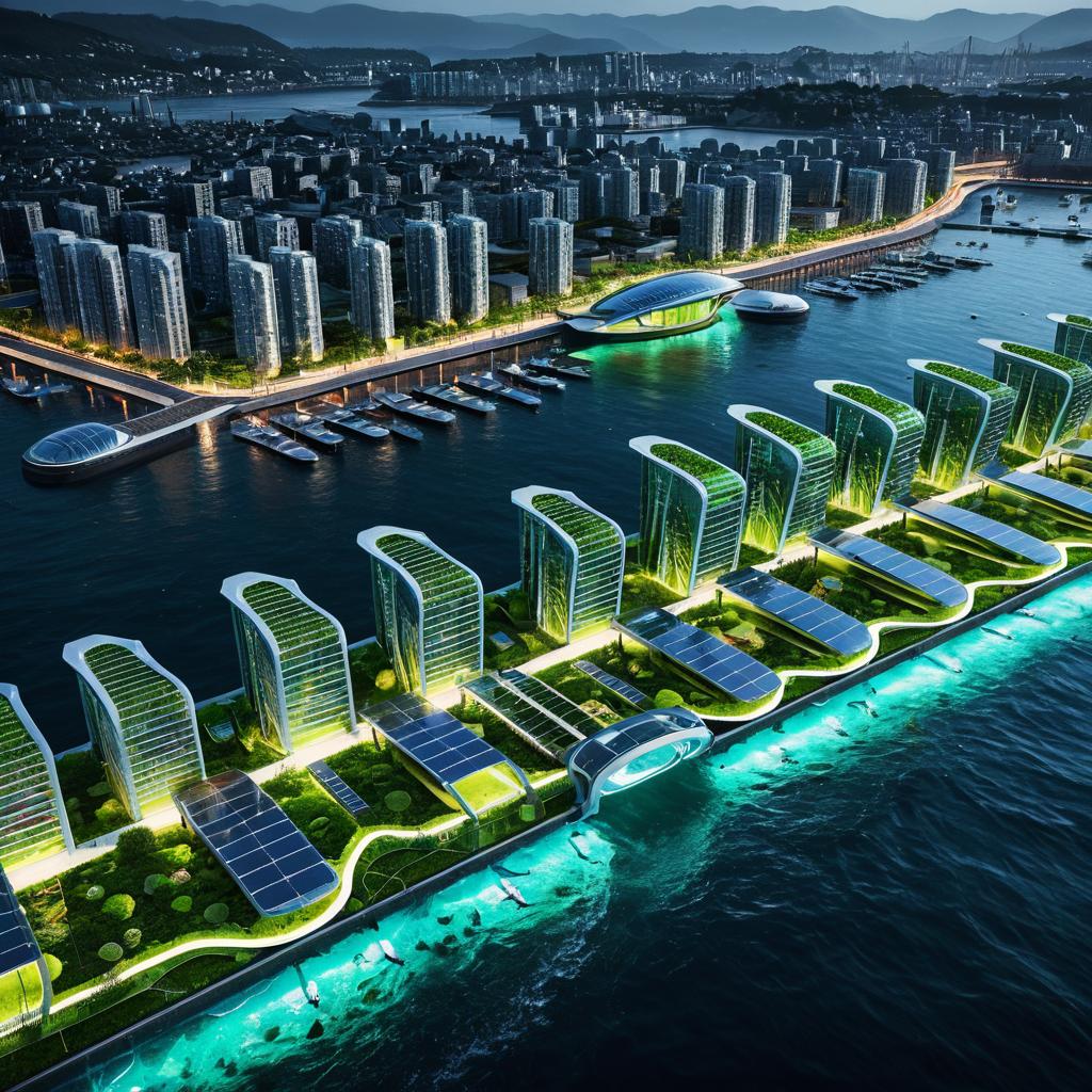 A futuristic waterfront cityscape featuring advanced tidal energy technology, glowing wave-powered lighting, bioengineered algal facades, floating vertical gardens, and lush green rooftops. The design showcases sleek, ultramodern architecture with automated energy optimization systems and vibrant eco-friendly neon accents, set during twilight. Surrounding the city are clear waters illuminated by underwater lighting, complementing the sustainable urban environment.