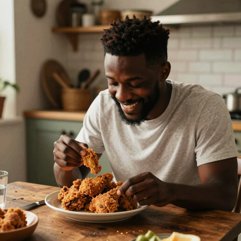 Black man eating chicken at a cozy rustic kitchen table, warm lighting, casual clothes, joyful expression, detailed textures of crispy fried chicken pieces, homey atmosphere