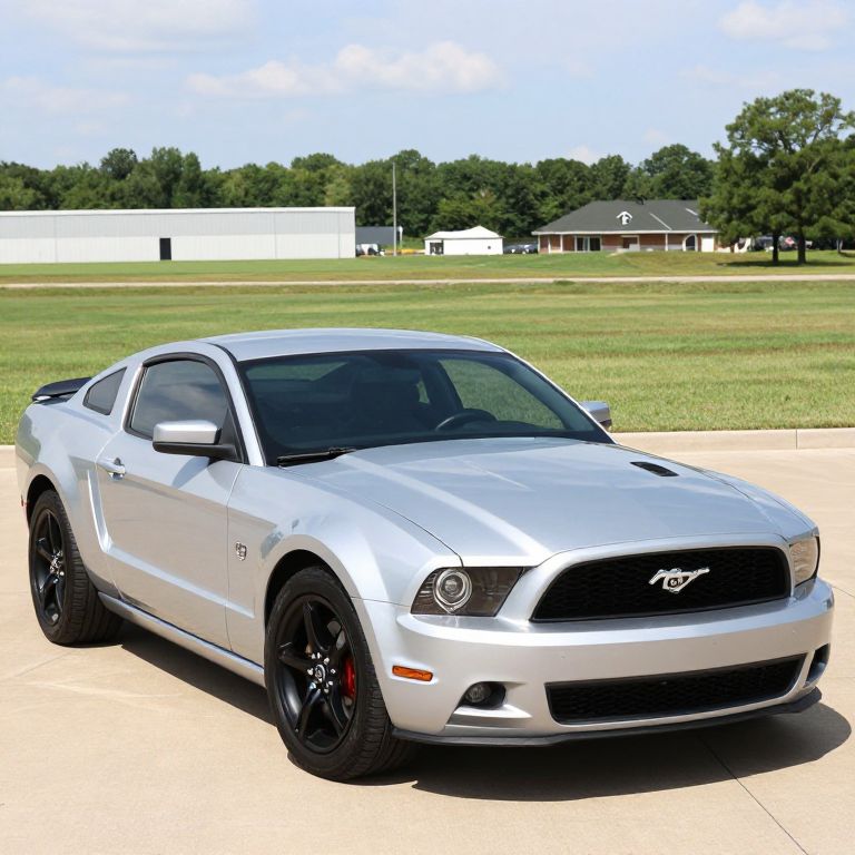 Photograph of a sleek, silver Ford Mustang with black wheels and red brake calipers parked on a concrete surface in a sunny, grassy field with