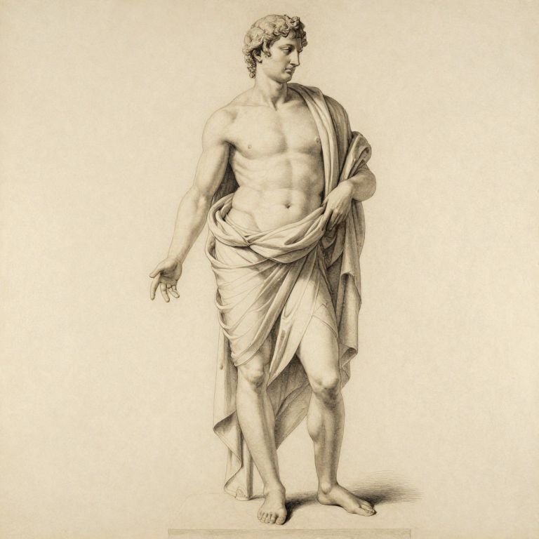 This is a sepia-toned, classical-style drawing of a male statue. The figure, with a muscular and well-defined physique, stands with his left arm slightly raised and his right arm hanging by his side. He has curly hair and wears a draped, flowing cloth around his waist, covering his genitals but leaving his chest and legs exposed. The cloth's folds are meticulously detailed, showing texture and movement. His expression is neutral, and he gazes slightly to his left. The background is plain and white, focusing attention on the statue. The drawing emphasizes realism and classical beauty, reminiscent of ancient Greek or Roman sculptures.