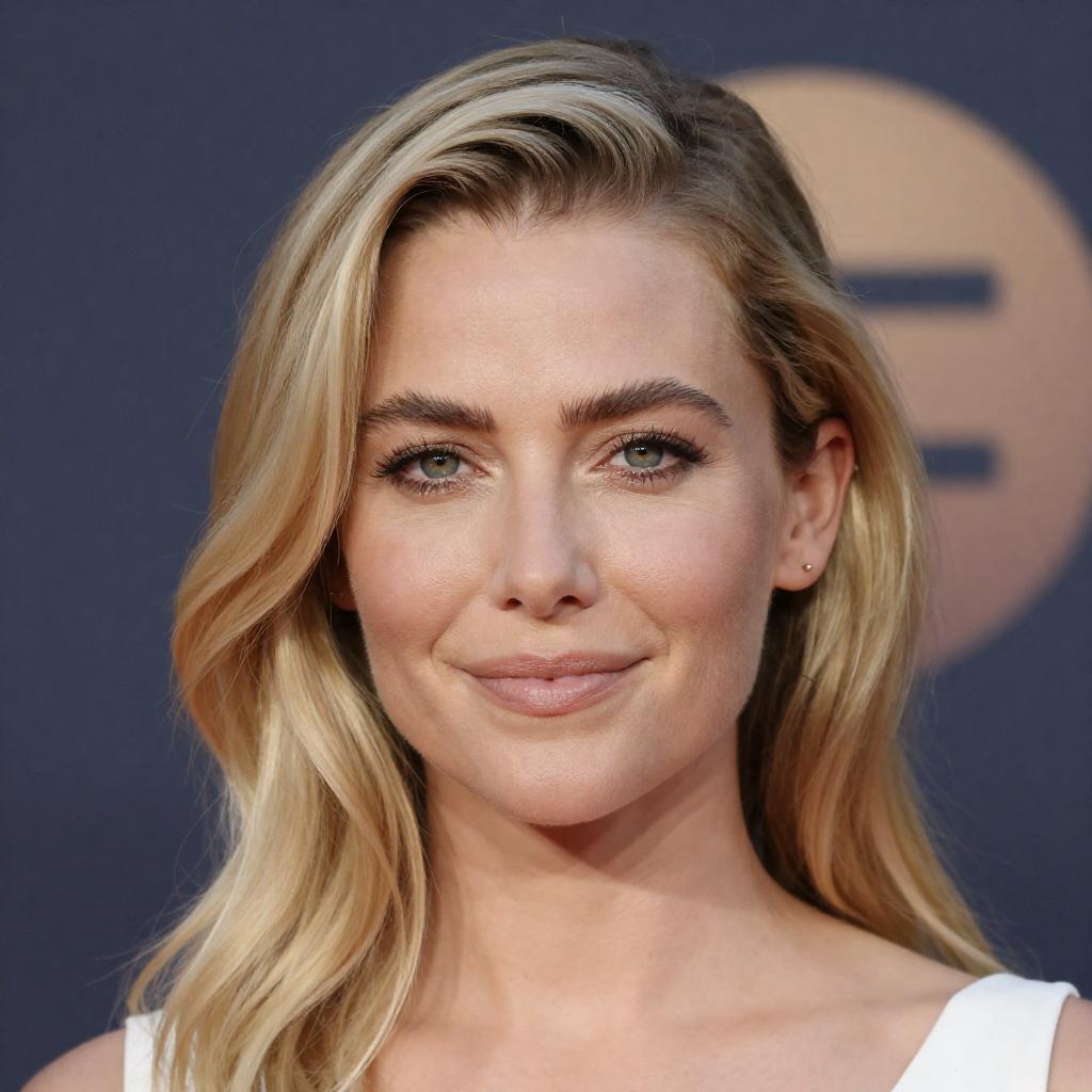 Close-up portrait of a smiling blonde woman with fair skin and curly hair. She wears red lipstick and light makeup, dressed in a black top. The background is dark red with a partially visible black object on the right side. She has a cheerful expression with slightly squinted eyes.