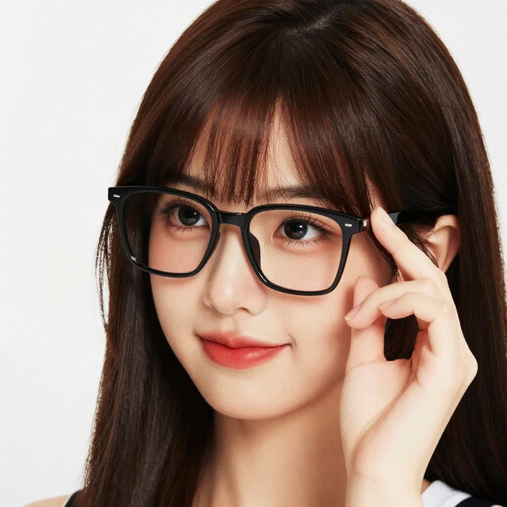 Photograph of a young woman with straight, dark brown hair and bangs, wearing black rectangular glasses. She has fair skin, red lipstick, and is looking slightly to the side with a subtle smile. Her right hand is gently adjusting her glasses. The background is completely white, making her the focal point. The image has a soft, slightly overexposed look.