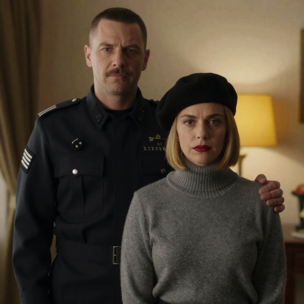 Photograph of a man and woman in a room. Man in dark military uniform with short hair, mustache, serious expression, stands behind woman. Woman with short blonde hair, red lipstick, wearing gray knitted turtleneck, black beret, serious expression. Lamp with yellow light in background, brown curtain partially visible. Man's left arm around woman's shoulder.