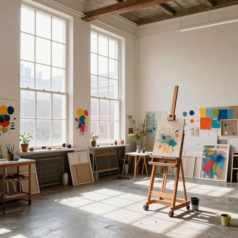 100sqm art studio with tall ceilings, large windows flooded with natural sunlight, scattered canvases and colorful paints, rustic wooden easel, creative and inspirational clutter, vivid color splashes on walls, warm and inviting creative space