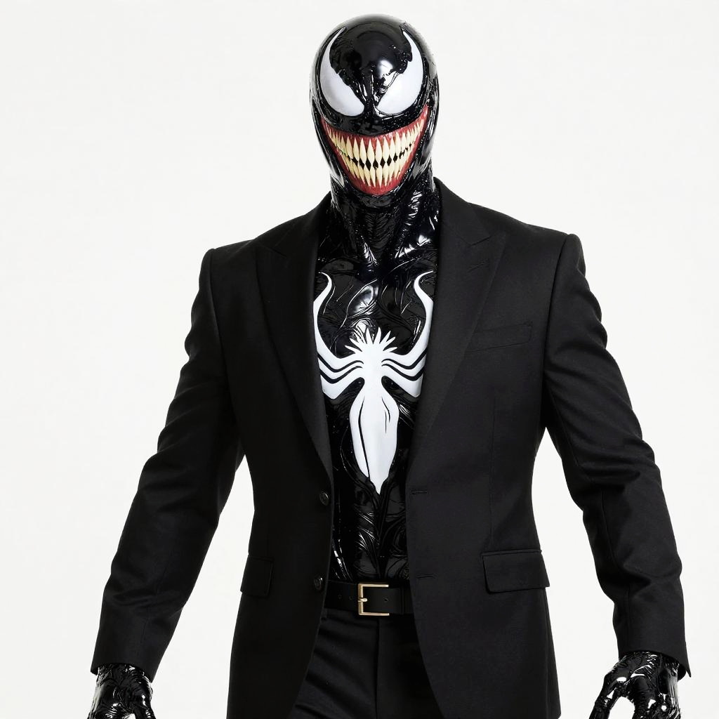 Photograph-style digital illustration of Venom, a Marvel Comics character, in a black suit. He has a glossy, black, web-patterned mask with a large, toothy grin and red, jagged lips. His chest features a white spider symbol. The suit is formal, with a black shirt underneath and black gloves. The background is pure white, highlighting Venom's dark, contrasting appearance. The image has a high-contrast, comic-book aesthetic, emphasizing Venom's menacing and mysterious look.