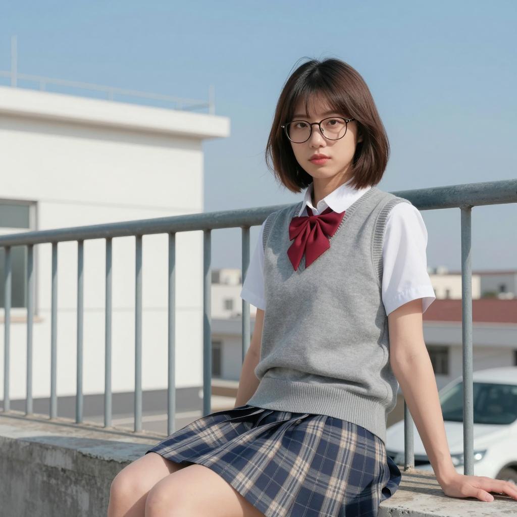 Two people on a street. One with short, dark hair, brown jacket, and tan scarf stands to the left, looking down. The other, with dark hair and a maroon hat, holds a camera in front of their face, standing to the right. Reflection in a window. Background: buildings, street sign, overcast sky.