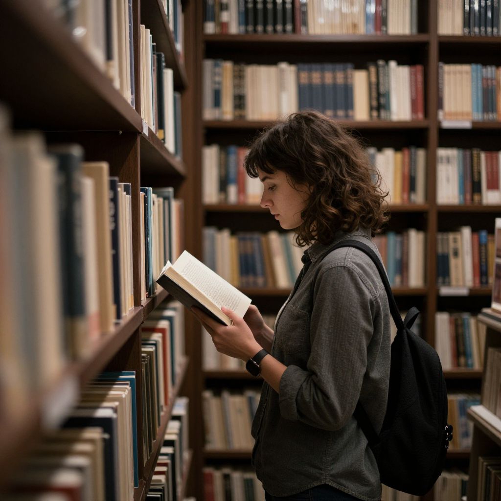 Woman browsing through rows of books in a dimly lit library, holding an open book while surrounded by shelves filled with neatly arranged volumes.