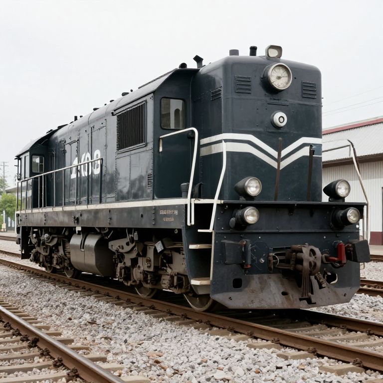 Photograph of a black diesel locomotive with white stripes on its front, standing on a gravel railway track. The train has a rectangular shape with a prominent front, two round headlights, and a smaller circular light above. The number "14" is visible on the front. The locomotive has metal railings and vents on the sides. In the background, there is a white building with a red roof. The sky is overcast, and the image has a slightly high-contrast, almost vintage style. The train's texture is metallic and slightly weathered.