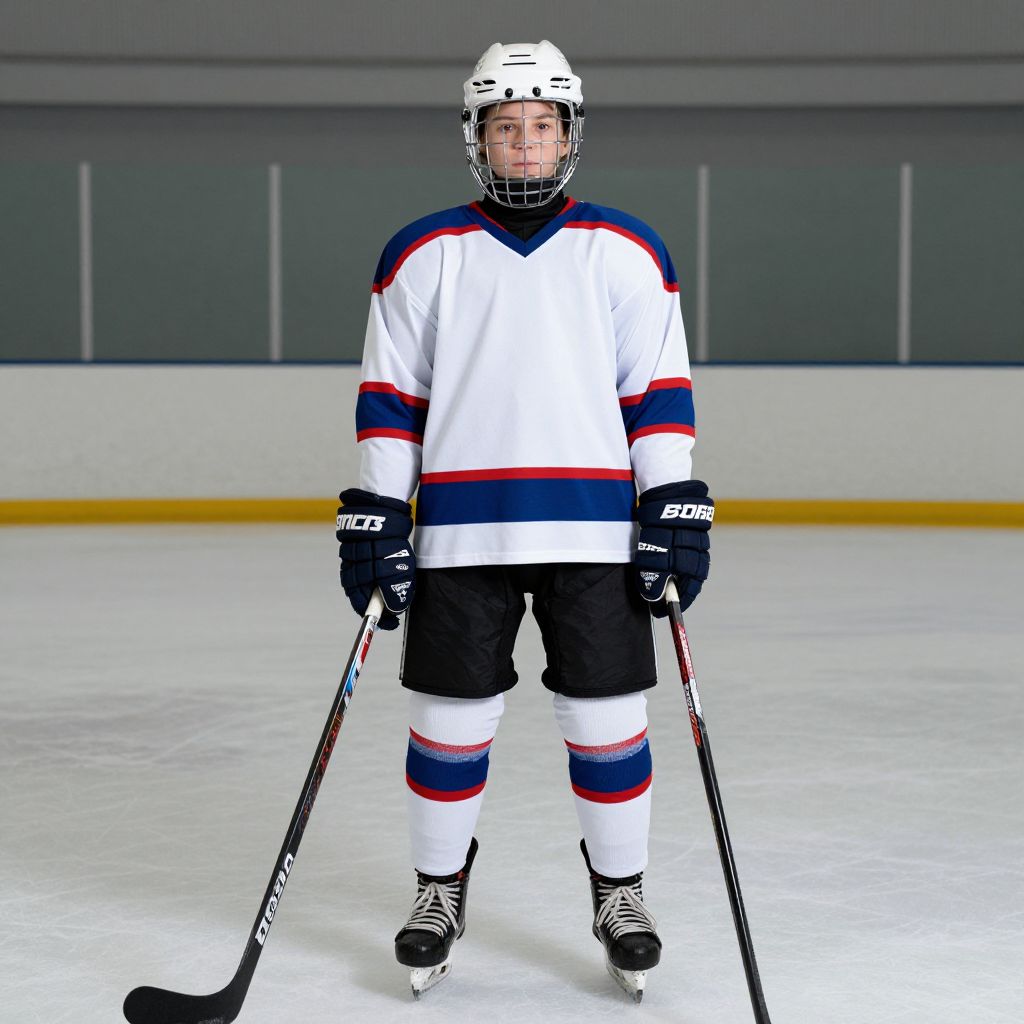 Photograph of a young male ice hockey player standing on an empty rink. He wears a white helmet with a clear face shield, a white jersey with blue and red stripes on the shoulders and sleeves, black shorts, white and blue knee pads, and black hockey gloves. He holds a black hockey stick in each hand. The rink has a white ice surface, gray walls, and a yellow barrier at the back. The player's expression is neutral, and he is centered in the frame. The image has a clean, bright lighting.