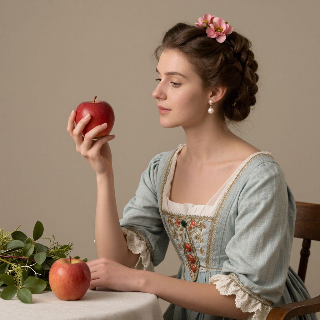 Woman in period attire delicately holding a red apple while seated at a table adorned with another apple and greenery, her hair adorned with pink flowers and a pearl earring, evoking a classical European scene.