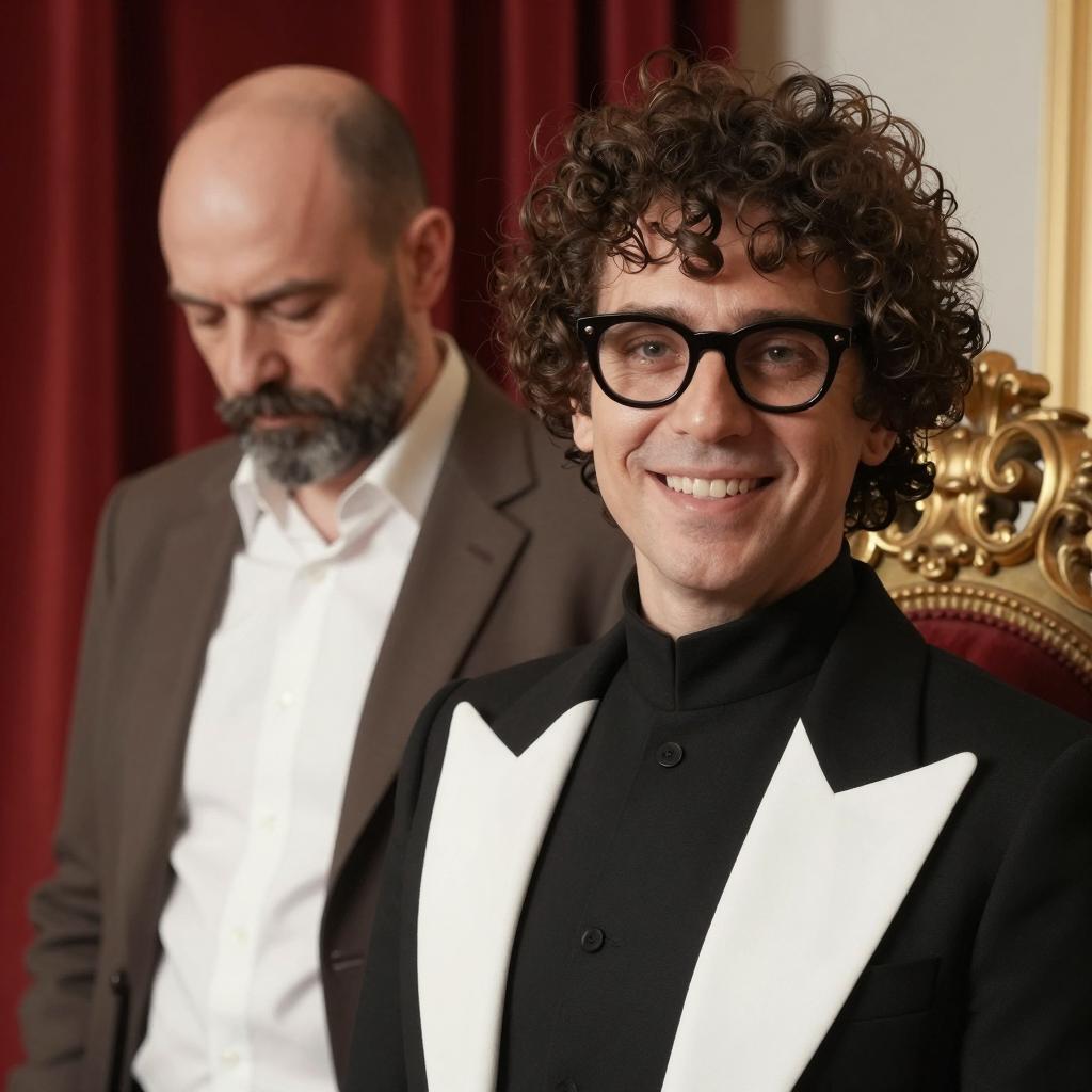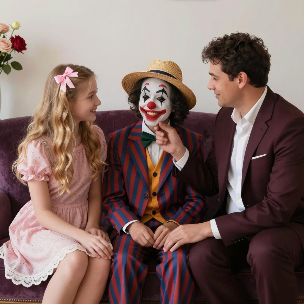 Photograph of five children. A man with curly hair, purple coat, and bow tie leans forward between two girls in red and black outfits, and two boys in yellow and blue shirts. Intense expressions on man's face. Bright indoor setting.