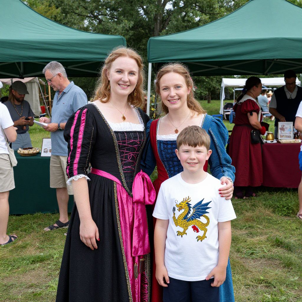 Guests dressed in vibrant Renaissance attire, including a woman in a black dress with a pink sash and a boy in a white shirt featuring a dragon emblem, pose together amidst the lively atmosphere of the Midsummer Fantasy Renaissance Faire at Warsaw Park in Ansonia, surrounded by green tents, vendors, and attendees enjoying the festivities.