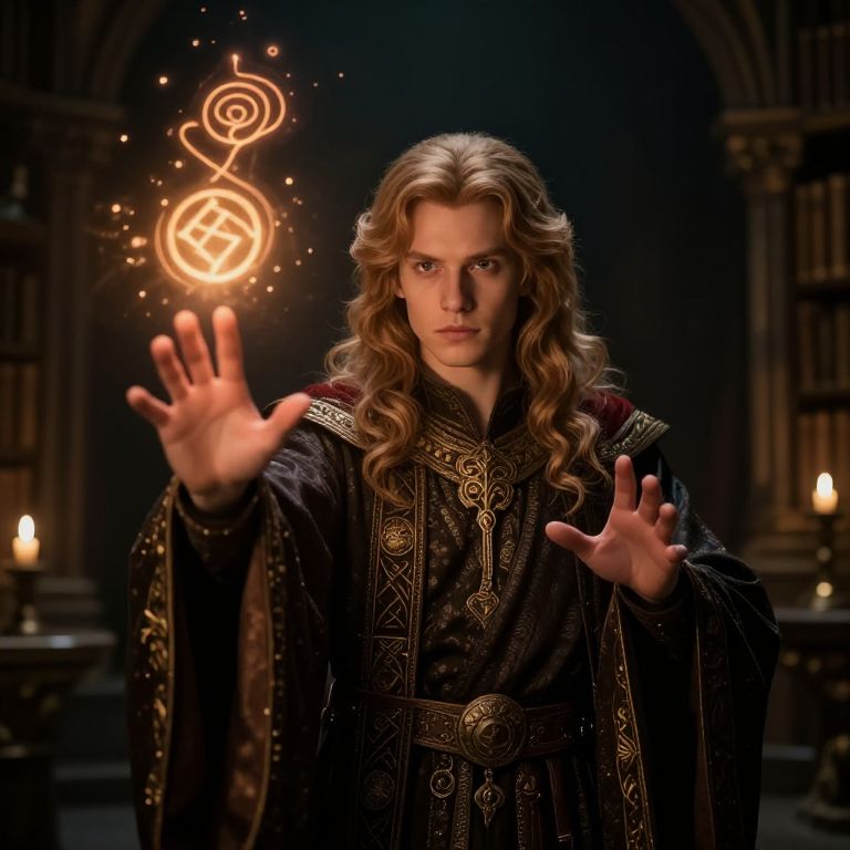 Photograph-style digital artwork of a young, long-haired man with wavy blonde hair, wearing an ornate black and gold medieval-style robe. He stands in a dimly lit, grand hall with arched windows and lit candles in the background. His hands are raised, palms facing forward, and he is conjuring glowing, mystical symbols above his right hand, including a circle and a Celtic knot, with small sparks surrounding them. His expression is intense and focused, with a slightly parted mouth. The lighting highlights his serious face and the intricate details of his robe, creating a dramatic, magical atmosphere.