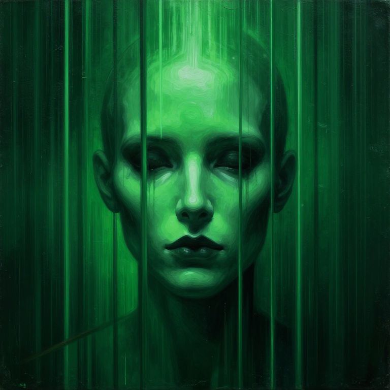 Smooth A Prison For Mind. the Matrix aesthetic, vertical abstract green codelines, surreal atmosphere, dark imagery, Over the top epic ness, shades of green colors, air brush symbolic painting.,