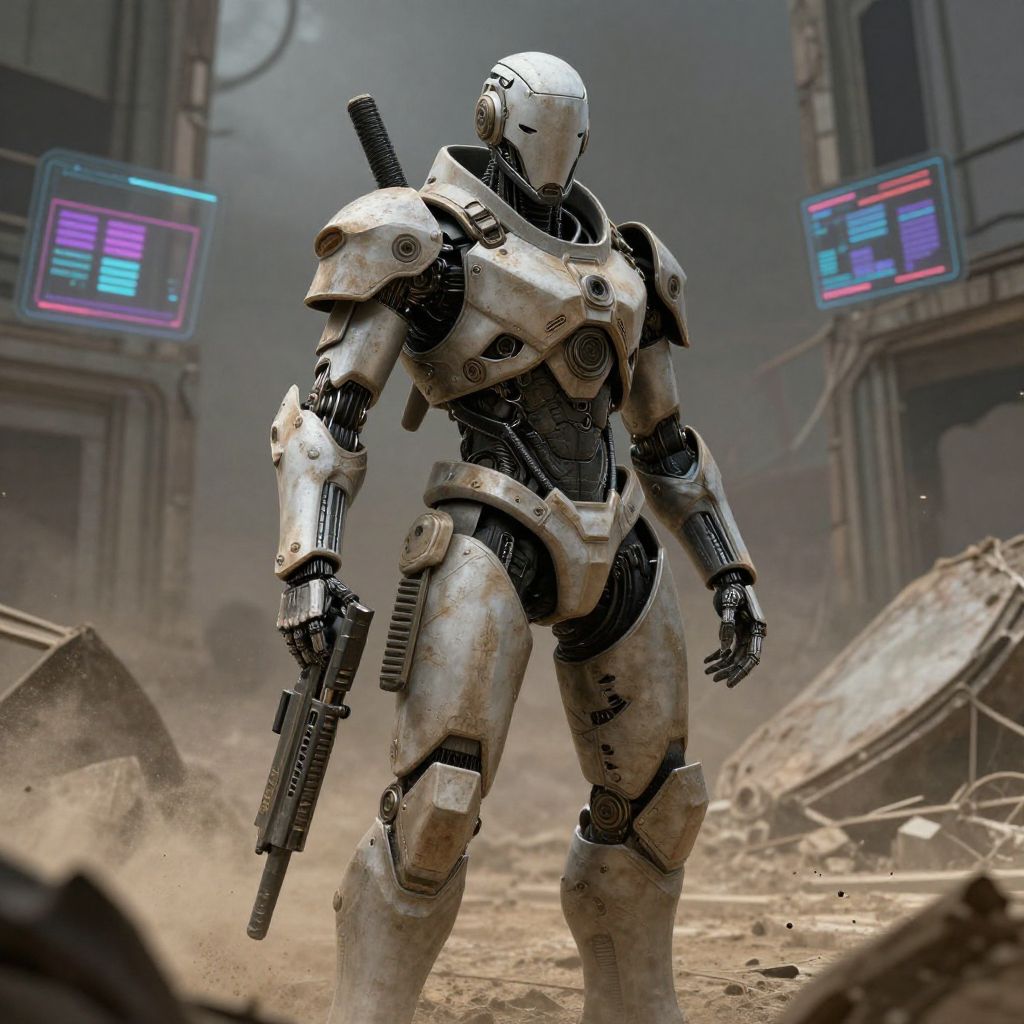 AI cover character in a post-apocalyptic world, half-human half-machine with rugged armor and visible mechanical components, holding advanced weaponry, dusty environment with ruined buildings and holographic displays flickering faintly, intense atmosphere of resilience and strength.