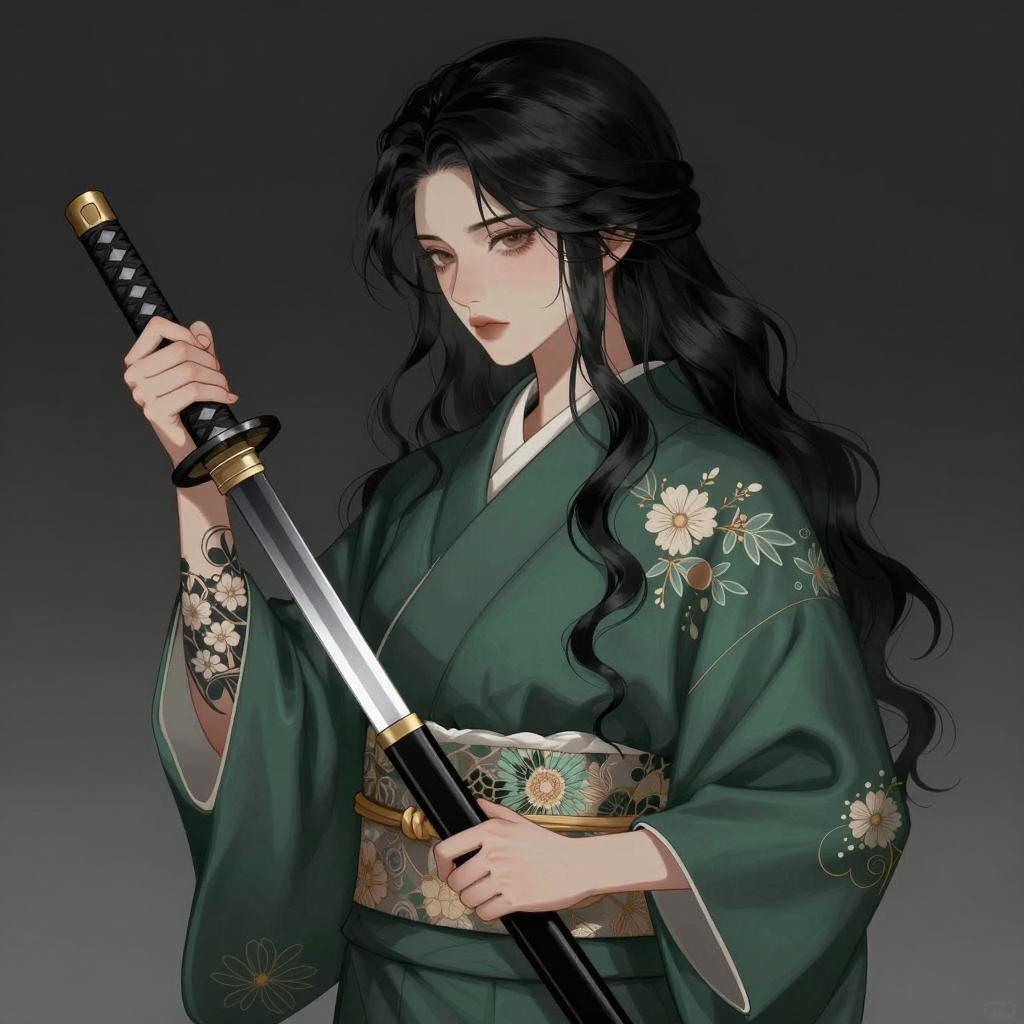 Asian Woman in Black Kimono with Sword